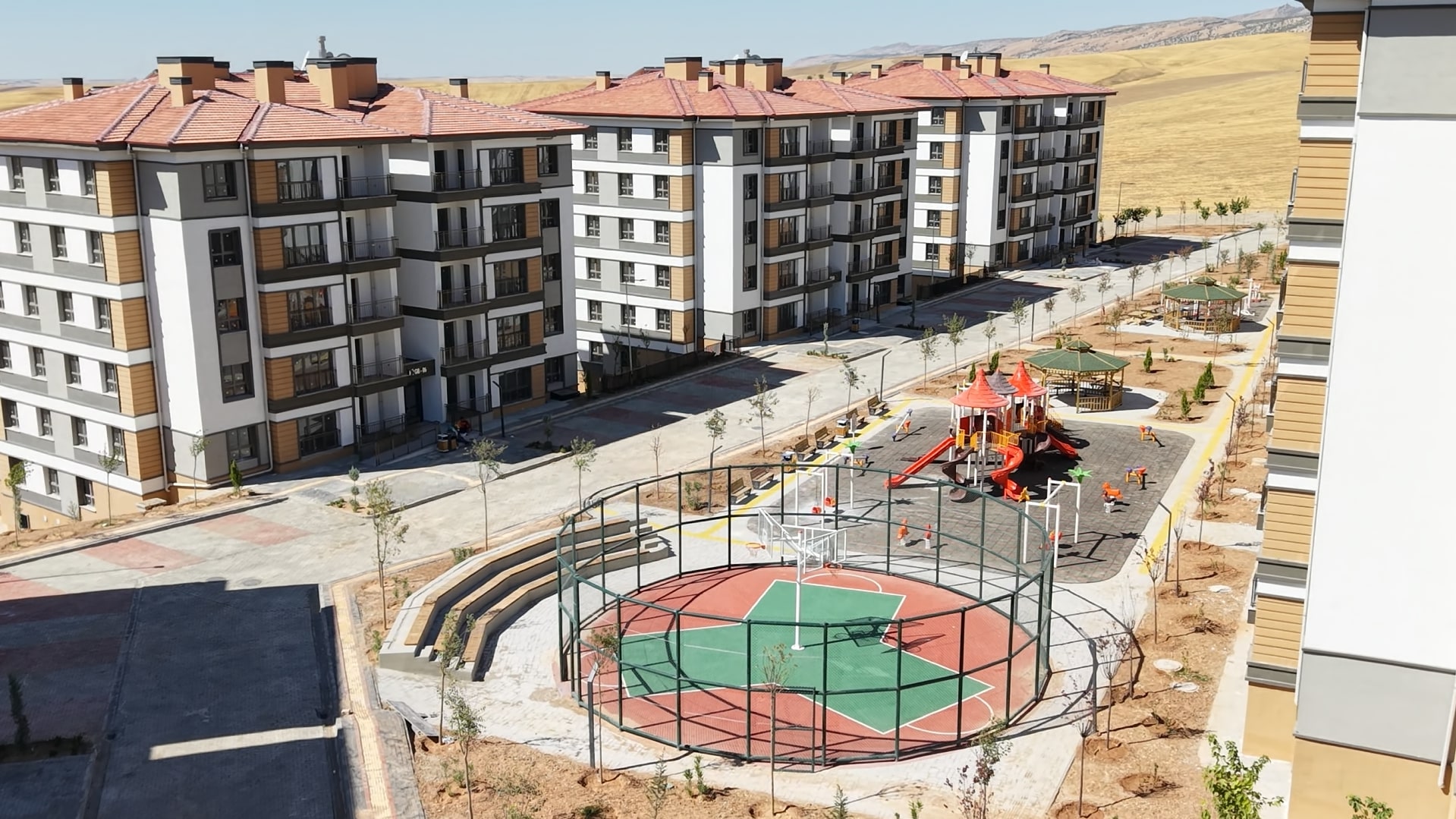 Yatay mimari anlayışıyla yapılan konutlar; radye temel üzerine, tünel kalıp sistemi ile depreme dayanıklı olarak inşa edildi.